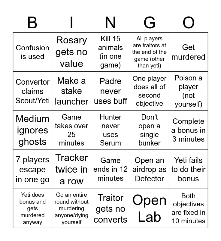 This bingo card has a free space and 24 words: Yeti does bonus and gets murdered anyway, Tracker twice in a row, Padre never uses buff, Open Lab, Get murdered, Confusion is used, Rosary gets no value, Kill 15 animals (in one game), Don't open a single bunker, Complete a bonus in 3 minutes, Medium ignores ghosts, Make a stake launcher, Open an airdrop as Defector, Yeti fails to do their bonus, Convertor claims Scout/Yeti, Go an entire round without murdering anyone/dying yourself, Traitor gets no converts, All players are traitors at the end of the game (other than yeti), Poison a player (not yourself), 7 players escape in one go, Game takes over 25 minutes, Game ends in 12 minutes, One player does all of second objective and Both objectives are fixed in 10 minutes.