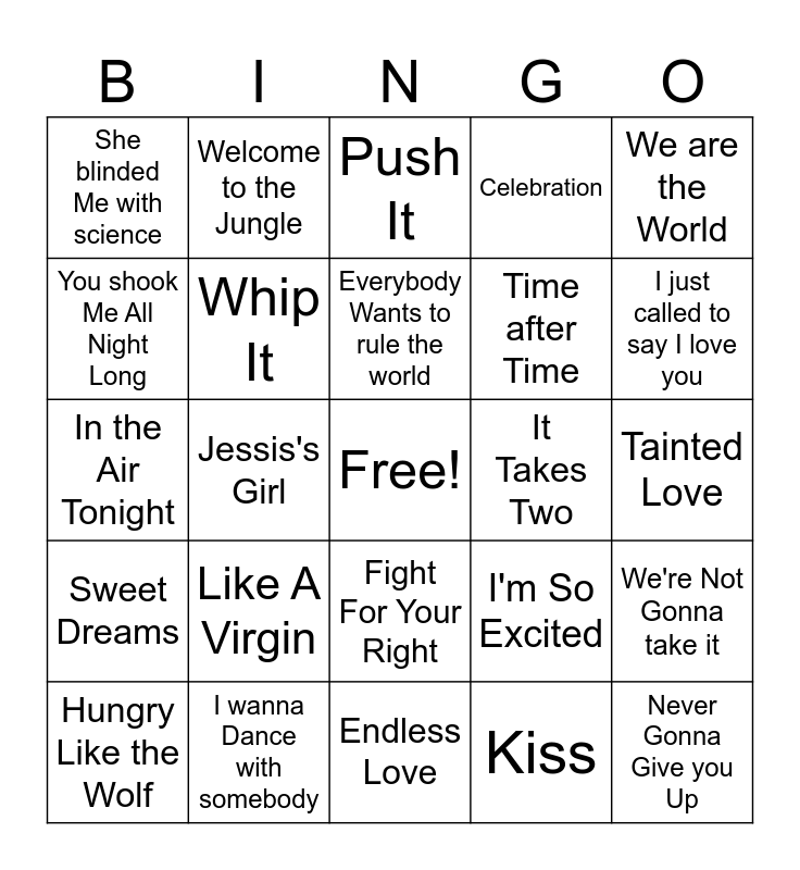 This bingo card has a free space and 24 words: Like A Virgin, I wanna Dance with somebody, Everybody Wants to rule the world, Hungry Like the Wolf, We are the World, She blinded Me with science, You shook Me All Night Long, Welcome to the Jungle, It Takes Two, Fight For Your Right, Time after Time, In the Air Tonight, I'm So Excited, We're Not Gonna take it, Whip It, Kiss, Tainted Love, Push It, I just called to say I love you, Jessis's Girl, Never Gonna Give you Up, Sweet Dreams, Celebration and Endless Love.