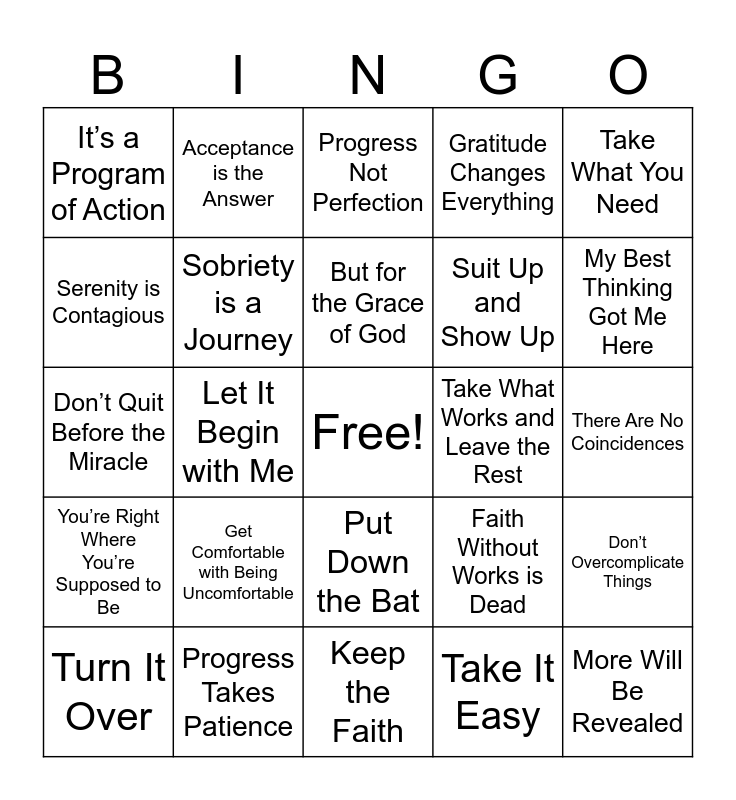 This bingo card has a free space and 75 words: One Day at a Time, Keep It Simple, Progress Not Perfection, Easy Does It, Let Go and Let God, First Things First, Live and Let Live, This Too Shall Pass, Stay in the Moment, Think, Think, Think, Keep Coming Back, It Works if You Work It, But for the Grace of God, Serenity is Contagious, Faith Over Fear, Let It Begin with Me, You Are Not Alone, More Will Be Revealed, Keep an Open Mind, Take What You Need, Trust the Process, Don’t Quit Before the Miracle, Sobriety is a Journey, Acceptance is the Answer, Gratitude Changes Everything, Recovery is Possible, HALT: Don’t Get Too Hungry, Angry, Lonely, or Tired, One is Too Many, a Thousand Never Enough, We Are as Sick as Our Secrets, Live Life on Life’s Terms, Principles Before Personalities, Honesty, Open-mindedness, and Willingness, Stick with the Winners, Faith Without Works is Dead, My Best Thinking Got Me Here, Suit Up and Show Up, Get Out of Your Head, Keep the Focus on Yourself, There Are No Coincidences, Take It Easy, Attitude of Gratitude, Let Go of Resentments, Meet People Where They Are, Stay Connected, The Power of Yet, Don’t Compare, Identify, Turn It Over, It’s a Program of Action, Recovery is a Process, Be Part of the Solution, No Situation is Hopeless, Put Down the Bat, Stay Right-Sized, Walk the Walk, Be Quick to Forgive, You Didn’t Come This Far to Only Come This Far, Willingness is Key, Stick Around, Give Yourself Grace, The Steps Are in Order for a Reason, Get Comfortable with Being Uncomfortable, You Can’t Pour from an Empty Cup, Avoid the Stinkin’ Thinkin’, Change Happens Outside the Comfort Zone, Bring the Body, the Mind Will Follow, Take What Works and Leave the Rest, One Drink is Too Many, and a Thousand is Never Enough, The Gift of Desperation, Every Day is a Second Chance, Don’t Overcomplicate Things, You’re Right Where You’re Supposed to Be, Progress Takes Patience, Recovery is a Gift, Keep the Faith and Small Steps Lead to Big Changes.