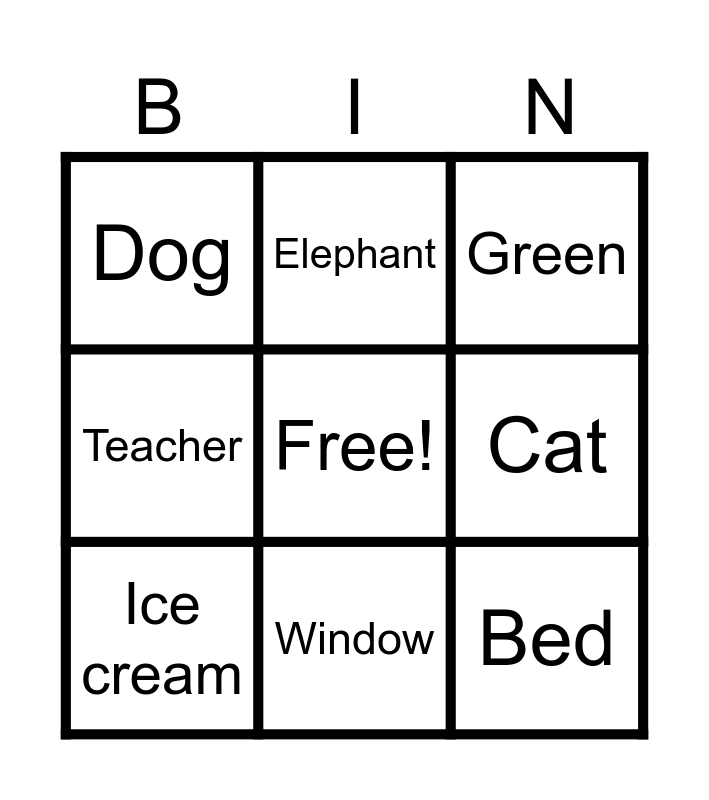 This bingo card has a free space and 25 words: Chair, Table, Window, Door, Bed, Dog, Cat, Elephant, Fish, Bird, Apple, Banana, Pizza, Milk, Ice cream, Red, Blue, Green, Sun, Tree, Book, Pencil, Backpack, Teacher and School.