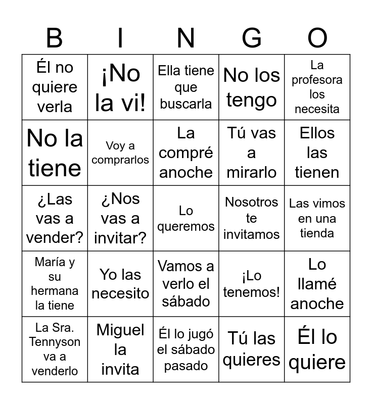 This bingo card has 25 words: Yo las necesito, Él lo jugó el sábado pasado, La compré anoche, La Sra. Tennyson va a venderlo, La profesora los necesita, Él no quiere verla, No la tiene, ¡No la vi!, Nosotros te invitamos, Vamos a verlo el sábado, Tú vas a mirarlo, ¿Las vas a vender?, ¡Lo tenemos!, Lo llamé anoche, Voy a comprarlos, Él lo quiere, Las vimos en una tienda, Ella tiene que buscarla, Ellos las tienen, ¿Nos vas a invitar?, Lo queremos, Miguel la invita, María y su hermana la tiene, No los tengo and Tú las quieres.