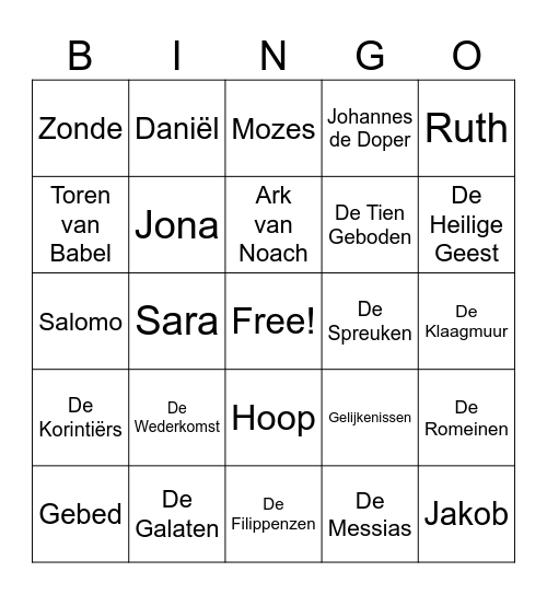 This bingo card has a free space and 75 words: Noach, 10, Mozes, David, Jezus, Bethlehem, 12, Kruisiging, Opstanding, Paulus, Genesis, Openbaring, Ark van Noach, Toren van Babel, Abraham, Sara, Isaak, Jakob, Jozef, Ruth, Samuël, Salomo, Jona, Daniël, Johannes de Doper, Petrus, Judas, Maria, Lazarus, Het Laatste Avondmaal, De Bergrede, De Gouden Regel, Wonderen, Gelijkenissen, De Heilige Geest, De Tien Geboden, De Tabernakel, De Tempel van Salomo, De Klaagmuur, De Messias, Het Oude Testament, Het Nieuwe Testament, De Bijbel, De Kerk, De Doop, Het Avondmaal, Gebed, Zonde, Vergeving, Genade, Geloof, Hoop, Liefde, De Hemel, De Hel, De Duivel, Engelen, De Schepping, De Zondeval, De Verlossing, De Wederkomst, De Drie-eenheid, De Apostelen, De Profeten, De Psalmen, De Spreuken, De Prediker, Het Hooglied, De Handelingen, De Romeinen, De Korintiërs, De Galaten, De Efeziërs, De Filippenzen and De Openbaring.