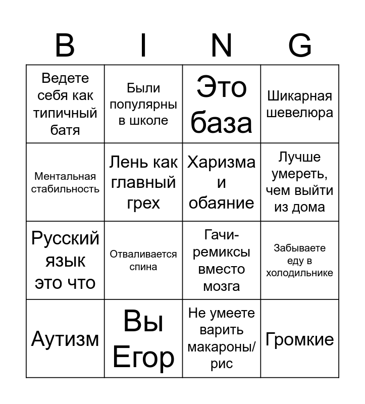 This bingo card has 16 words: Вы Егор, Забываете еду в холодильнике, Это база, Ведете себя как типичный батя, Русский язык это что, Были популярны в школе, Гачи-ремиксы вместо мозга, Не умеете варить макароны/рис, Ментальная стабильность, Лень как главный грех, Аутизм, Шикарная шевелюра, Отваливается спина, Лучше умереть, чем выйти из дома, Харизма и обаяние and Громкие.