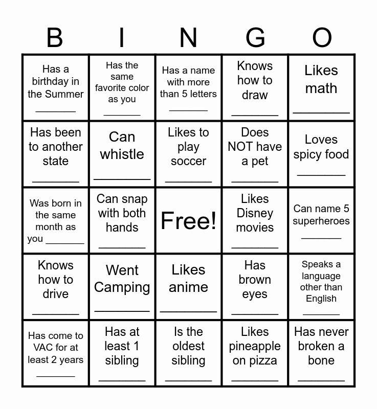 This bingo card has a free space and 24 words: Went Camping _______, Has at least 1 sibling _______, Likes to play soccer _______, Has come to VAC for at least 2 years _______, Likes math _______, Has a birthday in the Summer _______, Has been to another state _______, Has the same favorite color as you _______, Likes Disney movies _______, Likes anime _______, Does NOT have a pet _______, Was born in the same month as you _______, Has brown eyes _______, Speaks a language other than English _______, Can whistle _______, Likes pineapple on pizza _______, Can name 5 superheroes _______, Has a name with more than 5 letters _______, Loves spicy food _______, Can snap with both hands _______, Has never broken a bone _______, Knows how to drive _______, Knows how to draw _______ and Is the oldest sibling _______.