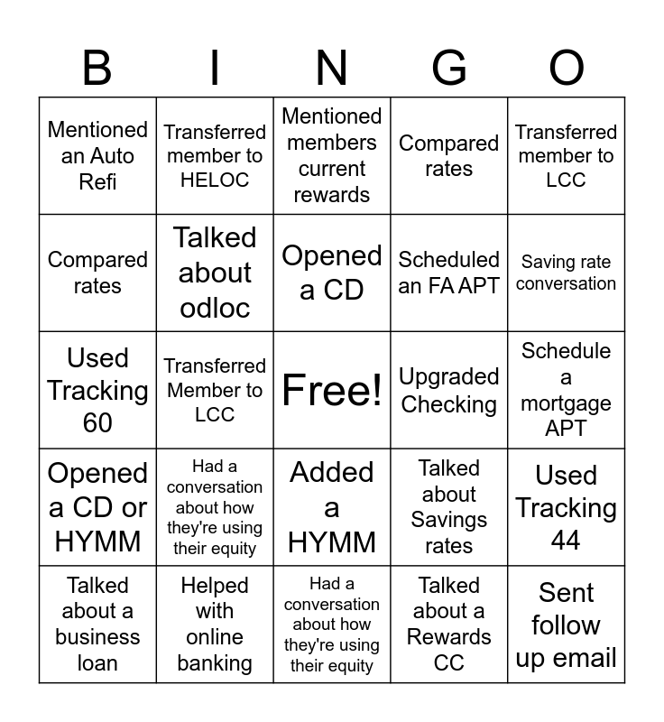 This bingo card has a free space and 24 words: Had a conversation about how they're using their equity, Helped with online banking, Opened a CD, Talked about a business loan, Transferred member to LCC, Mentioned an Auto Refi, Compared rates, Transferred member to HELOC, Upgraded Checking, Added a HYMM, Scheduled an FA APT, Used Tracking 60, Talked about Savings rates, Used Tracking 44, Talked about odloc, Talked about a Rewards CC, Schedule a mortgage APT, Mentioned members current rewards, Saving rate conversation, Transferred Member to LCC, Sent follow up email, Opened a CD or HYMM, Compared rates and Had a conversation about how they're using their equity.