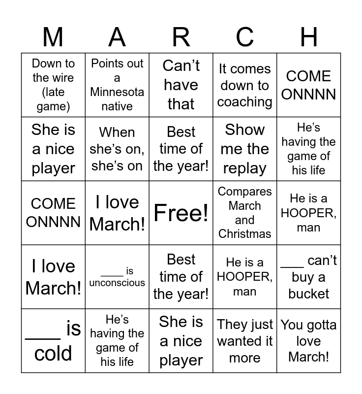 This bingo card has a free space and 53 words: He’s having the game of his life, You gotta love March!, What the f**k bro, They just wanted it more, ____ is unconscious, You gotta make that/those, Points out a Minnesota native, It comes down to coaching, She is a nice player, Can’t have that, When she’s on, she’s on, Nice take, ___ can’t buy a bucket, He is a HOOPER, man, They’re just out of sorts, ___ is cold, Best time of the year!, Compares March and Christmas, ___ is shooting lights out, COME ONNNN, I love March!, That’s just the kind of day they’re having, Show me the replay, Down to the wire (late game), He’s having the game of his life, He’s having the game of his life, He’s having the game of his life, He’s having the game of his life, He’s having the game of his life, He’s having the game of his life, You gotta love March!, What the f**k bro, They just wanted it more, ____ is unconscious, You gotta make that/those, Points out a Minnesota native, It comes down to coaching, She is a nice player, Can’t have that, When she’s on, she’s on, Nice take, ___ can’t buy a bucket, He is a HOOPER, man, They’re just out of sorts, ___ is cold, Best time of the year!, Compares March and Christmas, ___ is shooting lights out, COME ONNNN, I love March!, That’s just the kind of day they’re having, Show me the replay and Down to the wire (late game).