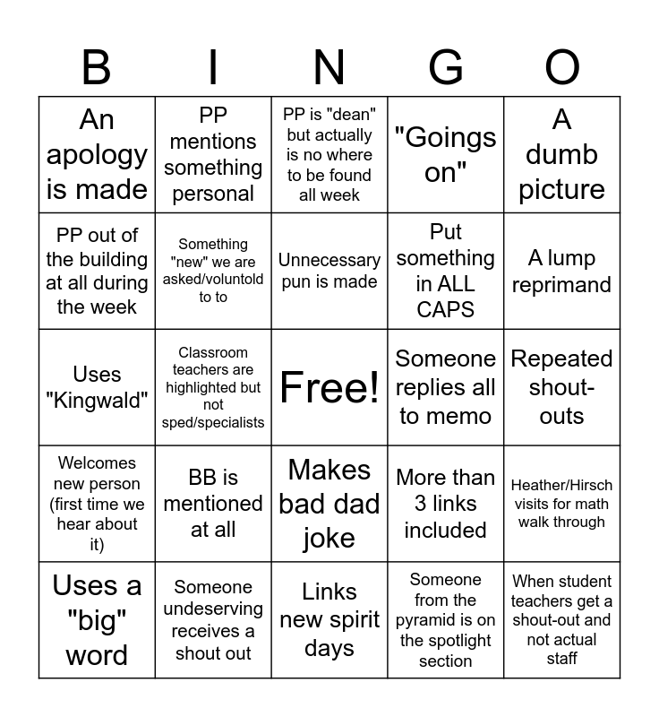 This bingo card has a free space and 24 words: BB is mentioned at all, Someone undeserving receives a shout out, Unnecessary pun is made, Uses a "big" word, A dumb picture, An apology is made, PP out of the building at all during the week, PP mentions something personal, Someone replies all to memo, Makes bad dad joke, Put something in ALL CAPS, Uses "Kingwald", More than 3 links included, Heather/Hirsch visits for math walk through, Something "new" we are asked/voluntold to to, Someone from the pyramid is on the spotlight section, Repeated shout-outs, PP is "dean" but actually is no where to be found all week, A lump reprimand, Classroom teachers are highlighted but not sped/specialists, When student teachers get a shout-out and not actual staff, Welcomes new person (first time we hear about it), "Goings on" and Links new spirit days.