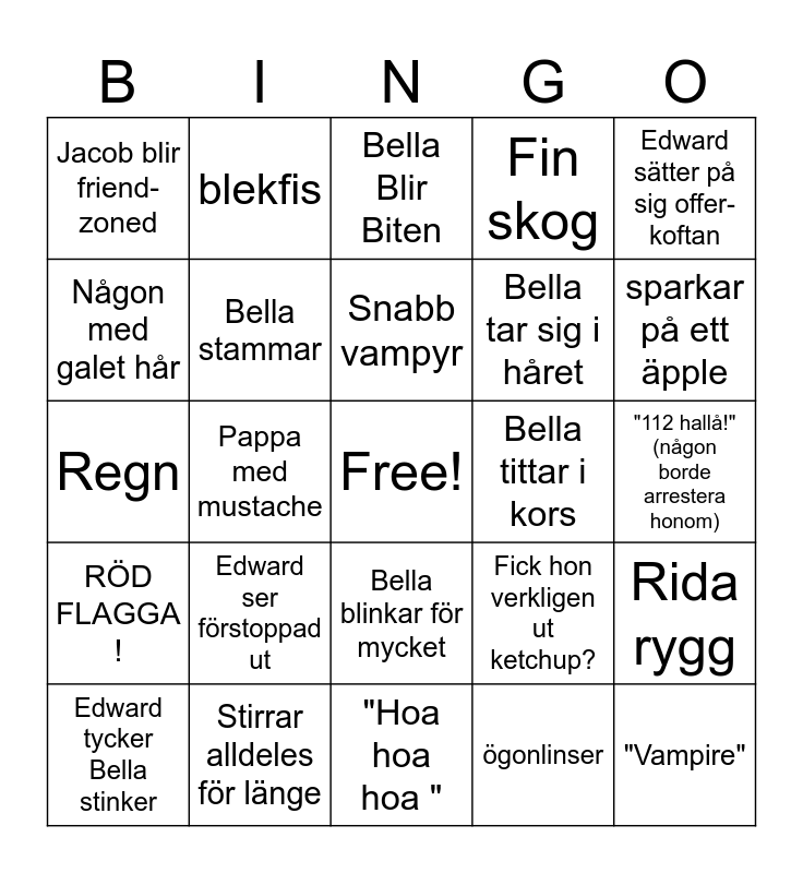 This bingo card has a free space and 29 words: Edward tycker Bella stinker, Glittrar som bara den, Pappa med mustache, 1963 Chevy Pickup, Jacob blir friend-zoned, Bella Blir Biten, Bella stammar, Edward ser förstoppad ut, Bella tittar i kors, Stirrar alldeles för länge, "112 hallå!"(någon borde arrestera honom), "Vampire", "Hoa hoa hoa ", ögonlinser, sparkar på ett äpple, Edward, vilken hjälte, Bella blinkar för mycket, RÖD FLAGGA !, Edward sätter på sig offer-koftan, Regn, Fick hon verkligen ut ketchup?, 1 Braincell, Bella tar sig i håret, Någon med galet hår, Fin skog, blekfis, Rida rygg, Snabb vampyr and Arg vampyr.