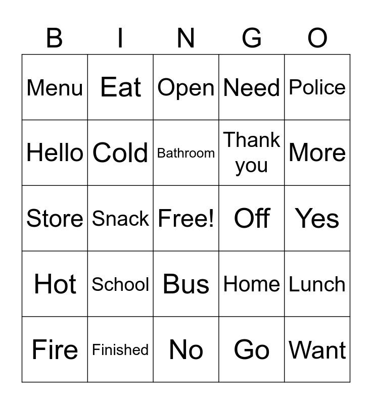 This bingo card has a free space and 34 words: Stop, Go, Help, Danger, Hot, Cold, Police, Fire, Eat, Drink, Bathroom, Open, Close, On, Off, More, Finished, Store, School, Home, Bus, Money, Menu, Yes, No, Want, Need, Please, Thank you, Hello, Goodbye, Snack, Lunch and Dinner.