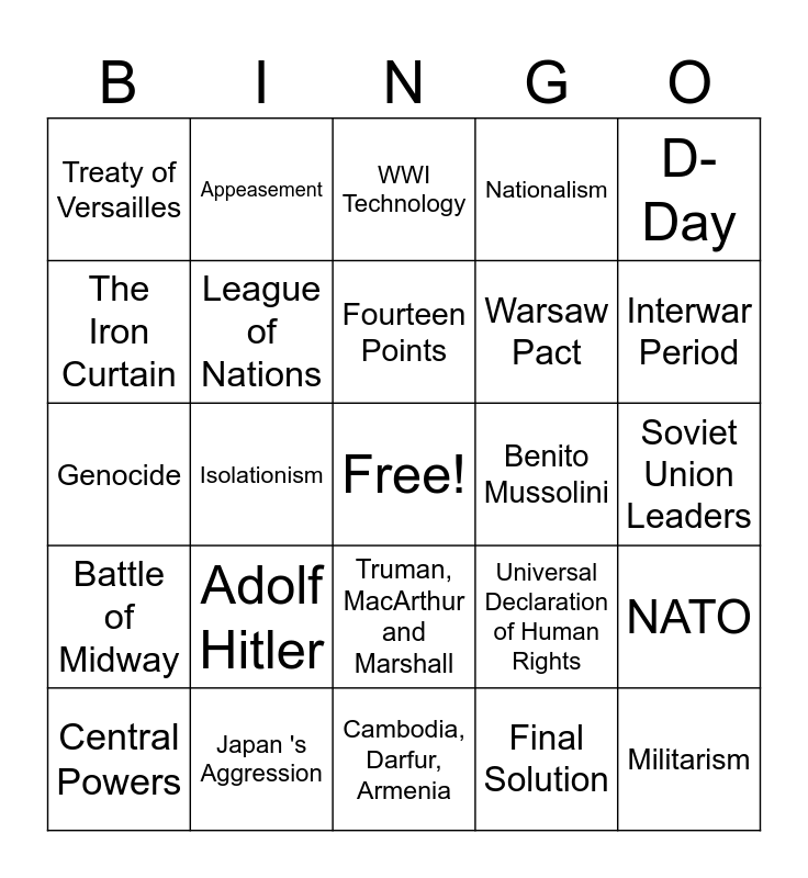 This bingo card has a free space and 29 words: Central Powers, Allied Powers, Isolationism, Woodrow Wilson, Treaty of Versailles, WWI Technology, League of Nations, Adolf Hitler, Benito Mussolini, Japan 's Aggression, Soviet Union Leaders, Militarism, Cambodia, Darfur, Armenia, Final Solution, Interwar Period, Germany invades Poland in 1939, Truman, MacArthur and Marshall, Battle of Midway, D-Day, Genocide, Universal Declaration of Human Rights, Marshall Plan, Warsaw Pact, The Iron Curtain, Nationalism, Appeasement, NATO, Fourteen Points and Atomic Bombs.