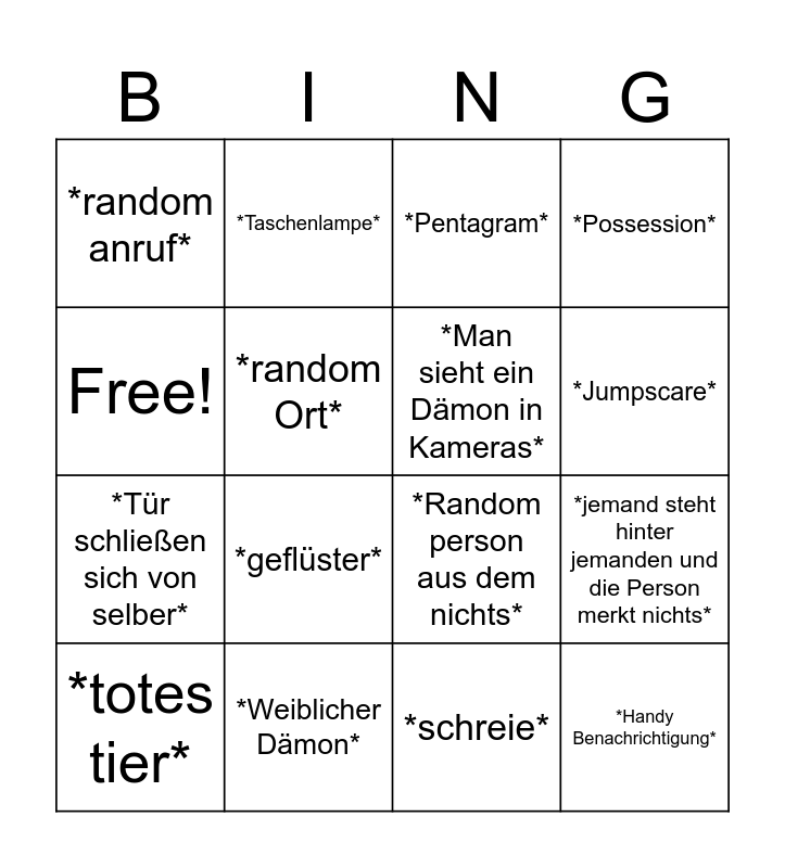 This bingo card has 16 words: *Weiblicher Dämon*, *jemand steht hinter jemanden und die Person merkt nichts*, *Pentagram*, *random anruf*, *Tür schließen sich von selber*, *Taschenlampe*, *Random person aus dem nichts*, *schreie*, Free!, *random Ort*, *totes tier*, *Possession*, *geflüster*, *Jumpscare*, *Man sieht ein Dämon in Kameras* and *Handy Benachrichtigung*.