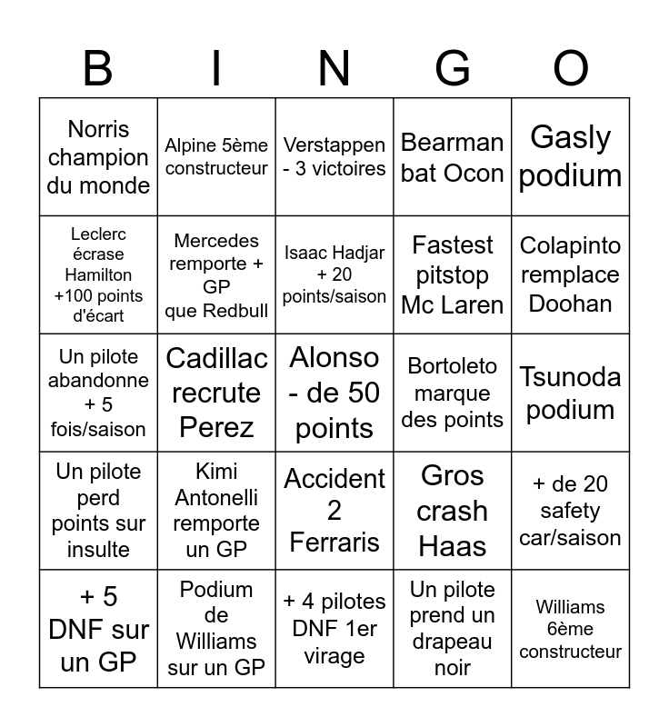 This bingo card has a free space and 24 words: Kimi Antonelli remporte un GP, Podium de Williams sur un GP, Isaac Hadjar + 20 points/saison, + 5 DNF sur un GP, Gasly podium, Norris champion du monde, Leclerc écrase Hamilton +100 points d'écart, Alpine 5ème constructeur, Bortoleto marque des points, Accident 2 Ferraris, Fastest pitstop Mc Laren, Un pilote abandonne + 5 fois/saison, Gros crash Haas, + de 20 safety car/saison, Mercedes remporte + GP que Redbull, Un pilote prend un drapeau noir, Tsunoda podium, Verstappen - 3 victoires, Colapinto remplace Doohan, Cadillac recrute Perez, Williams 6ème constructeur, Un pilote perd points sur insulte, Bearman bat Ocon and + 4 pilotes DNF 1er virage.