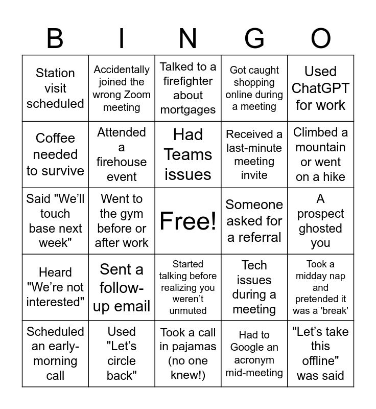This bingo card has a free space and 24 words: Sent a follow-up email, Used "Let’s circle back", Had Teams issues, Scheduled an early-morning call, Used ChatGPT for work, Station visit scheduled, Coffee needed to survive, Accidentally joined the wrong Zoom meeting, Someone asked for a referral, Started talking before realizing you weren’t unmuted, Received a last-minute meeting invite, Said "We’ll touch base next week", Tech issues during a meeting, Took a midday nap and pretended it was a 'break', Attended a firehouse event, Had to Google an acronym mid-meeting, A prospect ghosted you, Talked to a firefighter about mortgages, Climbed a mountain or went on a hike, Went to the gym before or after work, "Let’s take this offline" was said, Heard "We’re not interested", Got caught shopping online during a meeting and Took a call in pajamas (no one knew!).