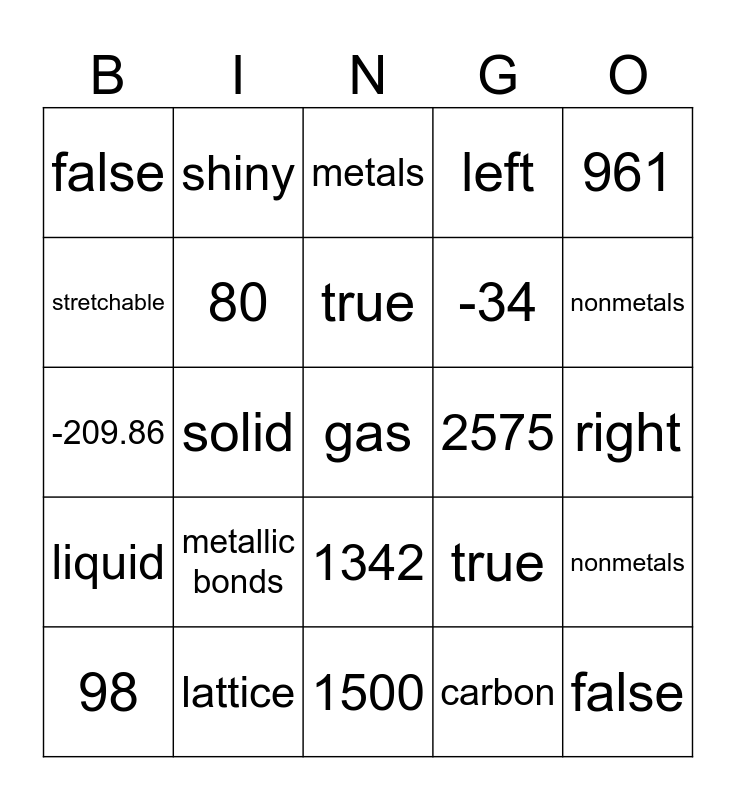 This bingo card has a free space and 24 words: metallic bonds, lattice, true, 98, 961, false, stretchable, shiny, 2575, 1342, -34, -209.86, true, nonmetals, 80, carbon, right, metals, nonmetals, solid, false, liquid, left and 1500.