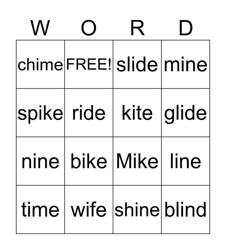 This bingo card has a free space and 15 words: time, blind, slide, chime, glide, spike, bike, shine, ride, nine, line, mine, kite, FREE! and wife.