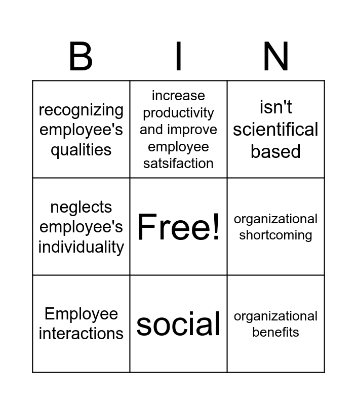 This bingo card has a free space and 9 words: Employee interactions, isn't scientifical based, increase productivity and improve employee satsifaction, neglects employee's individuality, recognizing employee's qualities, organizational shortcoming, organizational benefits, positive and social.