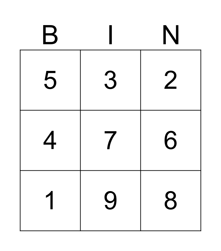 This bingo card has 9 words: 1, 2, 3, 4, 5, 6, 7, 8 and 9.