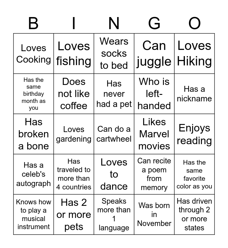 This bingo card has 25 words: Has traveled to more than 4 countries, Speaks more than 1 language, Has never had a pet, Knows how to play a musical instrument, Loves Hiking, Loves Cooking, Has the same birthday month as you, Loves fishing, Likes Marvel movies, Loves to dance, Who is left- handed, Has broken a bone, Can recite a poem from memory, Has the same favorite color as you, Does not like coffee, Has driven through 2 or more states, Enjoys reading, Wears socks to bed, Has a nickname, Loves gardening, Can do a cartwheel, Has 2 or more pets, Has a celeb's autograph, Can juggle and Was born in November.