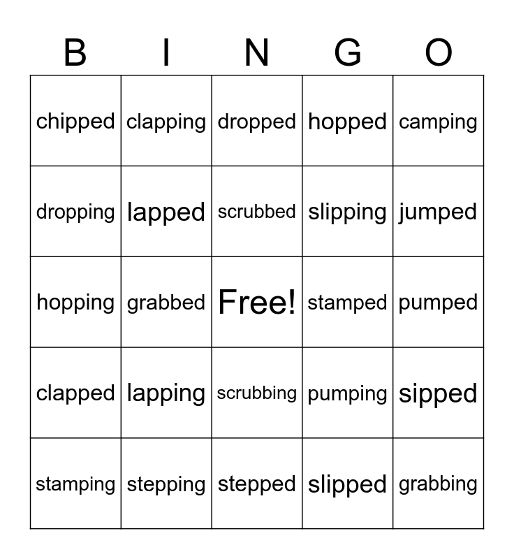 This bingo card has a free space and 28 words: sipped, sipping, slipping, slipped, dropping, dropped, clapping, clapped, stamped, stamping, hopping, hopped, stepping, stepped, jumped, jumping, lapping, lapped, scrubbed, scrubbing, chipped, chipping, grabbing, grabbed, pumped, pumping, camping and camped.