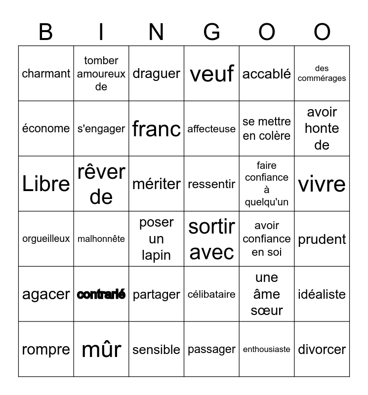 This bingo card has 36 words: célibataire, partager, passager, économe, orgueilleux, ressentir, s'engager, sensible, accablé, une âme sœur, avoir honte de, veuf, idéaliste, rêver de, affecteuse, charmant, agacer, faire confiance à quelqu'un, Libre, draguer, mériter, malhonnête, sortir avec, poser un lapin, avoir confiance en soi, tomber amoureux de, se mettre en colère, mûr, franc, des commérages, divorcer, rompre, prudent, vivre, contrarié and enthousiaste.