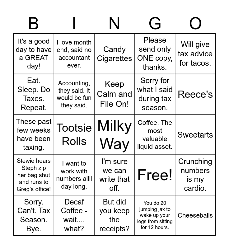 This bingo card has 25 words: I want to work with numbers allll day long., But did you keep the receipts?, Keep Calm and File On!, Sorry. Can't. Tax Season. Bye., Will give tax advice for tacos., It's a good day to have a GREAT day!, Eat. Sleep. Do Taxes. Repeat., I love month end, said no accountant ever., Coffee. The most valuable liquid asset., I'm sure we can write that off., Sorry for what I said during tax season., These past few weeks have been taxing., Free!, Crunching numbers is my cardio., Accounting, they said. It would be fun they said., Cheeseballs, Sweetarts, Candy Cigarettes, Reece's, Tootsie Rolls, Milky Way, Decaf Coffee - wait.... what?, Stewie hears Steph zip her bag shut and runs to Greg's office!, Please send only ONE copy, thanks. and You do 20 jumping jax to wake up your legs from sitting for 12 hours..