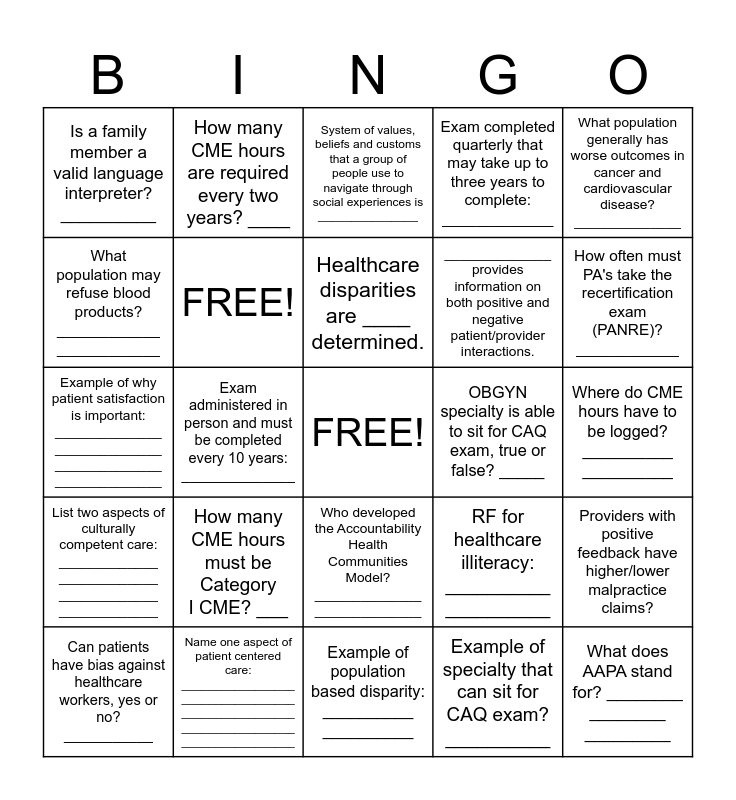 This bingo card has a free space and 24 words: How many CME hours must be Category I CME? ___, Name one aspect of patient centered care: _________________ _________________ _________________ _________________ _________________, Healthcare disparities are ____ determined., Can patients have bias against healthcare workers, yes or no? ___________, What population generally has worse outcomes in cancer and cardiovascular disease? ______________, Is a family member a valid language interpreter? __________, What population may refuse blood products? ____________ ____________, How many CME hours are required every two years? ____, OBGYN specialty is able to sit for CAQ exam, true or false? _____, Who developed the Accountability Health Communities Model? ______________ ______________, ______________ provides information on both positive and negative patient/provider interactions., Example of why patient satisfaction is important: ______________ ______________ ______________ ______________, RF for healthcare illiteracy: __________ __________, Providers with positive feedback have higher/lower malpractice claims?, FREE!, Example of specialty that can sit for CAQ exam? __________, Where do CME hours have to be logged? __________ __________, System of values, beliefs and customs that a group of people use to navigate through social experiences is _______________, How often must PA's take the recertification exam (PANRE)? ____________, Exam administered in person and must be completed every 10 years: ______________, What does AAPA stand for? ________ ________ _________, List two aspects of culturally competent care: _____________ _____________ _____________ _____________, Exam completed quarterly that may take up to three years to complete: _____________ and Example of population based disparity: __________ __________.
