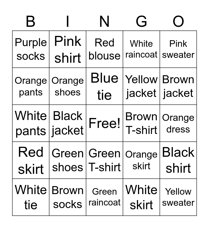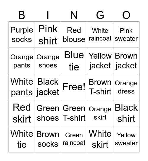 This bingo card has a free space and 40 words: Black dress, White pants, Yellow shirt, Orange shoes, Brown socks, Green T-shirt, Blue tie, Purple blouse, Pink sweater, Red skirt, Black jacket, White raincoat, Yellow sweater, Orange dress, Brown T-shirt, Green shoes, Blue pants, Purple socks, Pink tie, Red blouse, Black shirt, White skirt, Yellow jacket, Orange pants, Brown raincoat, Green tie, Blue sweater, Purple T-shirt, Pink shoes, Red socks, Black blouse, White tie, Yellow pants, Orange skirt, Brown jacket, Green raincoat, Blue dress, Purple shoes, Pink shirt and Red T-shirt.