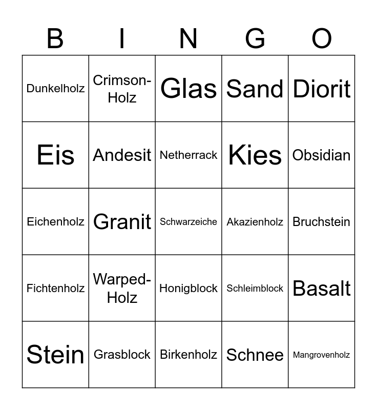 This bingo card has a free space and 24 words: Warped-Holz, Grasblock, Netherrack, Stein, Diorit, Dunkelholz, Eis, Crimson-Holz, Akazienholz, Honigblock, Kies, Eichenholz, Schleimblock, Basalt, Andesit, Schnee, Bruchstein, Glas, Obsidian, Granit, Mangrovenholz, Fichtenholz, Sand and Birkenholz.