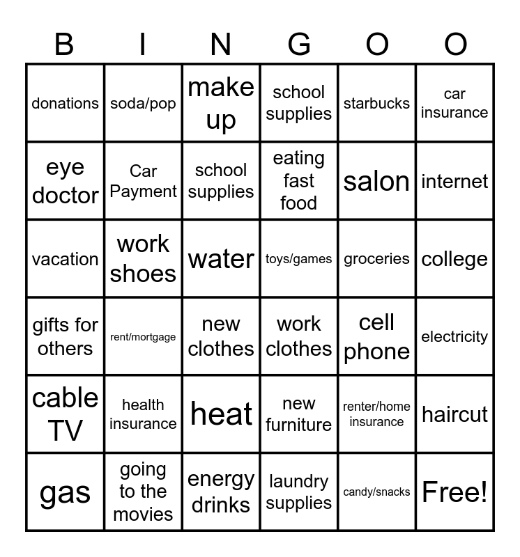This bingo card has 42 words: candy/snacks, Car Payment, Equipment, groceries, electricity, rent/mortgage, vacation, video games, make up, college, water, eating fast food, internet, starbucks, going to the movies, gifts for others, haircut, salon, Free!, soda/pop, car insurance, heat, cable TV, donations, dentist, gas, school supplies, hygiene products (toothpaste, deoderant), health insurance, renter/home insurance, savings account, toys/games, eye doctor, cell phone, energy drinks, new clothes, work clothes, work shoes, new furniture, laundry supplies, school supplies and pet.