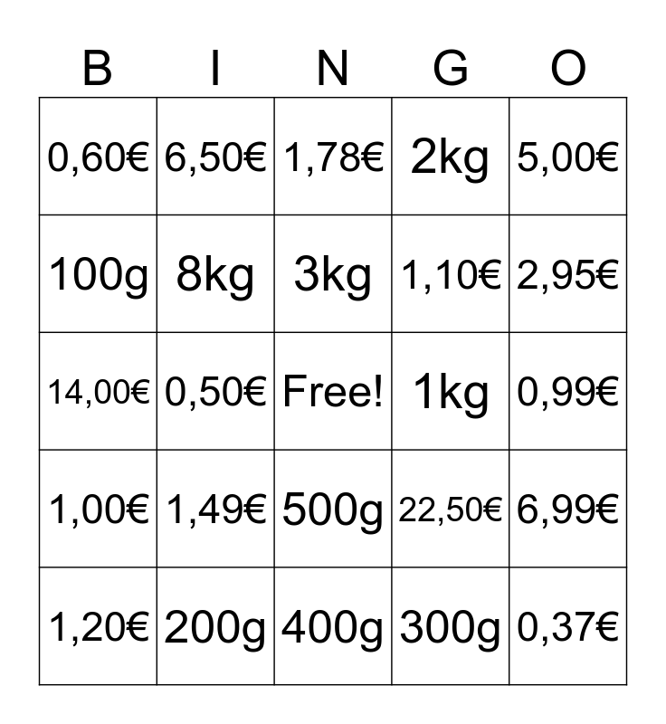 This bingo card has a free space and 24 words: 1,49€, 200g, 3kg, 1,20€, 5,00€, 0,60€, 100g, 6,50€, 1kg, 500g, 1,10€, 14,00€, 22,50€, 6,99€, 8kg, 300g, 0,99€, 1,78€, 2,95€, 0,50€, 0,37€, 1,00€, 2kg and 400g.