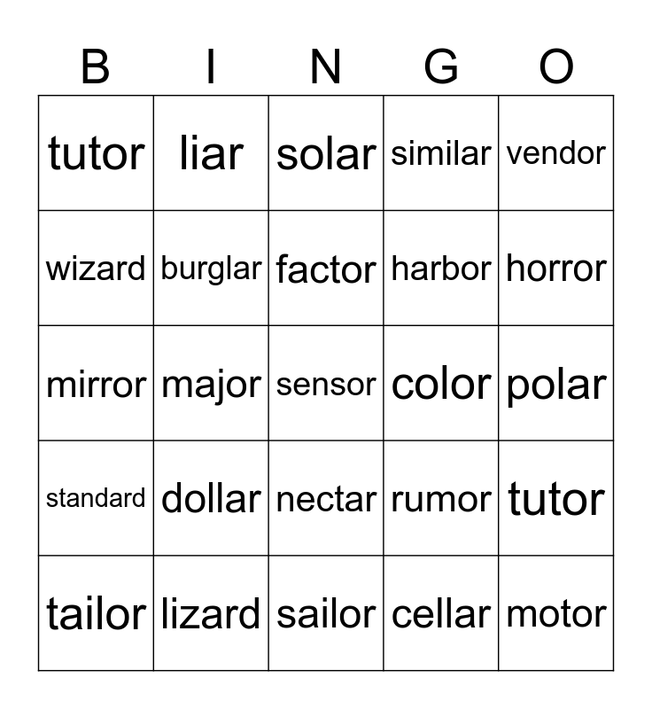 This bingo card has a free space and 24 words: dollar, lizard, factor, tailor, vendor, tutor, wizard, liar, color, nectar, harbor, mirror, rumor, tutor, burglar, cellar, polar, solar, horror, major, motor, standard, similar and sailor.
