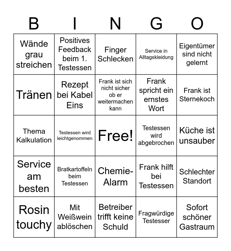 This bingo card has a free space and 24 words: Bratkartoffeln beim Testessen, Mit Weißwein ablöschen, Frank ist sich nicht sicher ob er weitermachen kann, Rosin touchy, Eigentümer sind nicht gelernt, Wände grau streichen, Tränen, Positives Feedback beim 1. Testessen, Testessen wird abgebrochen, Chemie-Alarm, Frank spricht ein ernstes Wort, Thema Kalkulation, Frank hilft bei Testessen, Schlechter Standort, Rezept bei Kabel Eins, Fragwürdige Testesser, Küche ist unsauber, Finger Schlecken, Frank ist Sternekoch, Testessen wird leichtgenommen, Sofort schöner Gastraum, Service am besten, Service in Alltagskleidung and Betreiber trifft keine Schuld.
