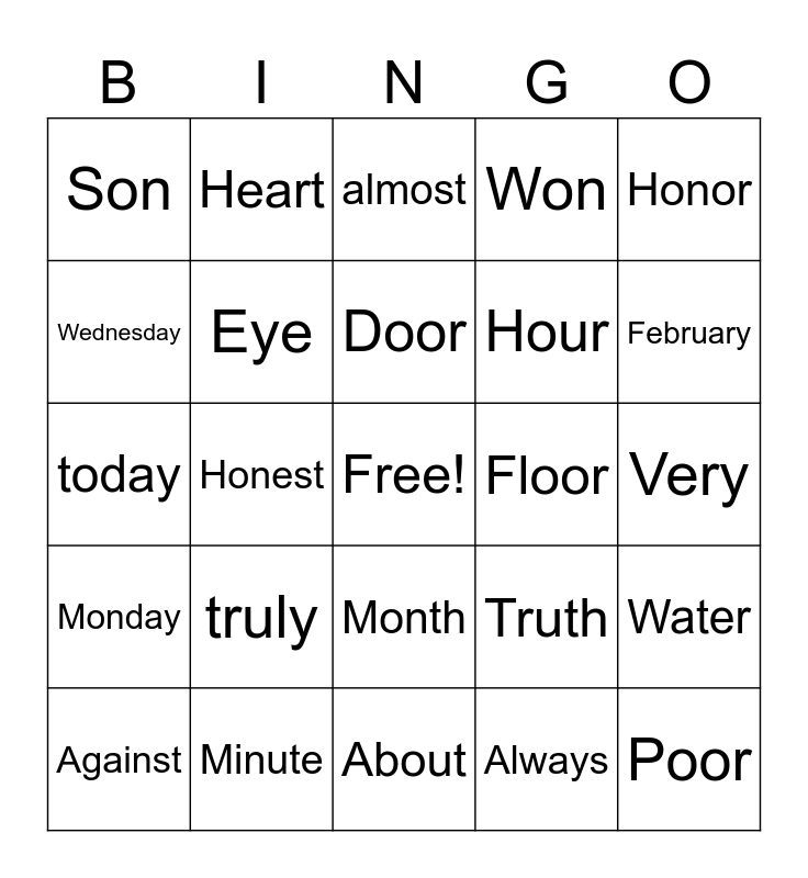 This bingo card has a free space and 24 words: truly, Minute, Door, Against, Honor, Son, Wednesday, Heart, Floor, Month, Hour, today, Truth, Water, Eye, Always, Very, almost, February, Honest, Poor, Monday, Won and About.