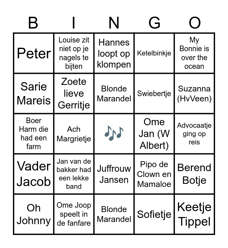 This bingo card has a free space and 30 words: Ome Joop speelt in de fanfare, Daisy, Ach Margrietje, Hansje Klein, Peter, Hannes loopt op klompen, Zoete lieve Gerritje, Juffrouw Jansen, Ome Jan (W Albert), Blonde Marandel, Advocaatje ging op reis, Keetje Tippel, Sofietje, Hop Marjanneke, Suzanna (HvVeen), Jan Klaassen de trompetter, Pipo de Clown en Mamaloe, Vader Jacob, Jan van de bakker had een lekke band, My Bonnie is over the ocean, Boer Harm die had een farm, Catootje, Louise zit niet op je nagels te bijten, Swiebertje, Sarie Mareis, Ketelbinkje, Berend Botje, Oh Johnny, Blonde Marandel and Keetje Tippel.