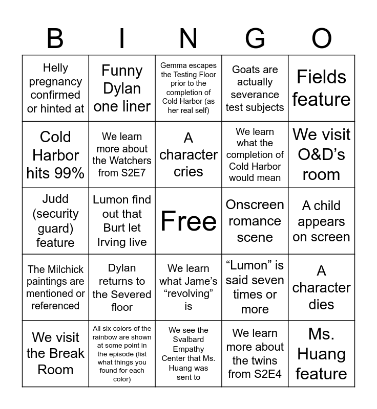 This bingo card has a free space and 47 words: Any character has a complete crashout, Ms. Huang feature, Reghabi feature, We see the Svalbard Empathy Center that Ms. Huang was sent to, Dylan returns to the Severed floor, Harmony Cobel feature, Funny Dylan one liner, Dr. Mauer Feature, Cold Harbor hits 99%, A green car appears on screen in any capacity, We learn more about the Watchers from S2E7, Goats are actually severance test subjects, A character dies, “Lumon” is said seven times or more, Irving feature, Drummond and Milchick’s argument is mentioned or referenced, A character cries, Onscreen romance scene, “Kier” is said seven times or more, Fields feature, Lumon find out that Burt let Irving live, We learn more about the twins from S2E4, Helly pregnancy confirmed or hinted at, We learn what the completion of Cold Harbor would mean, Any alcohol or drugs are consumed, We visit O&D’s room, We visit the Break Room, Natalie feature, We learn what Jame’s “revolving” is, The Milchick paintings are mentioned or referenced, We learn more of the true origin of Lumon, We visit the Testing Floor, We learn who “The Board” is, It is revealed that Lumon wants to upload consciousnesses into new bodies to achieve immortality, Any religion is mentioned by name; adjectives count (e.g. “Islamic”), All six colors of the rainbow are shown at some point in the episode (list what things you found for each color), A child appears on screen, Radar (Irving’s dog) feature, Mark and friends use the Glasgow Block to infiltrate Lumon with outie Mark and/or keep Innie Mark present in the outside world, It rains or snows in the episode (active precipitation, snow on the ground is not enough), Flashback, Gemma escapes the Testing Floor prior to the completion of Cold Harbor (as her real self), Judd (security guard) feature, Ricken feature, Crazy twist, A character screams and There is a physical altercation.