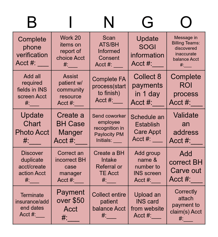 This bingo card has a free space and 24 words: Correct an incorrect BH case manager Acct #:___, Payment over $50 Acct #:___, Complete FA process(start to finish) Acct #:___, Terminate insurance/add end dates Acct #:___, Message in Billing Teams: discovered inaccurate balance Acct #:___, Complete phone verification Acct #: ___, Add all required fields in INS screen Acct #:___, Work 20 items on report of choice Acct #:___, Schedule an Establish Care Appt Acct #: ___, Create a BH Intake Referral or TE Acct #:___, Collect 8 payments in 1 day Acct #:___, Update Chart Photo Acct #:___, Add group name & number to INS screen Acct #:___, Add correct BH Carve out Acct #:___, Assist patient w/ community resource Acct #:___, Upload an INS card from website Acct #:___, Validate an address Acct #:___, Scan ATS/BH Informed Consent Acct #: ___, Complete ROI process Acct #:___, Create a BH Case Manger Acct #:___, Correctly attach payment to claim(s) Acct #:___, Discover duplicate acct/create action Acct #:___, Update SOGI information Acct #:___ and Collect entire patient balance Acct #:___.