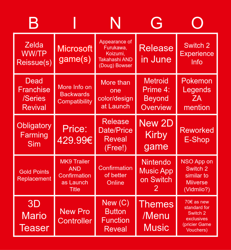 This bingo card has a free space and 24 words: MK9 Trailer AND Confirmation as Launch Title, New Pro Controller, More than one color/design at Launch, 3D Mario Teaser, Switch 2 Experience Info, Zelda WW/TP Reissue(s), Dead Franchise /Series Revival, Microsoft game(s), New 2D Kirby game, Confirmation of better Online, Metroid Prime 4: Beyond Overview, Obligatory Farming Sim, Nintendo Music App on Switch 2, NSO App on Switch 2 similar to Miiverse (Vidmiio?), More Info on Backwards Compatibility, Themes /Menu Music, Reworked E-Shop, Appearance of Furukawa, Koizumi, Takahashi AND (Doug) Bowser, Pokemon Legends ZA mention, Price: 429.99€, 70€ as new standard for Switch 2 exclusives (pricier Game Vouchers), Gold Points Replacement, Release in June and New (C) Button Function Reveal.