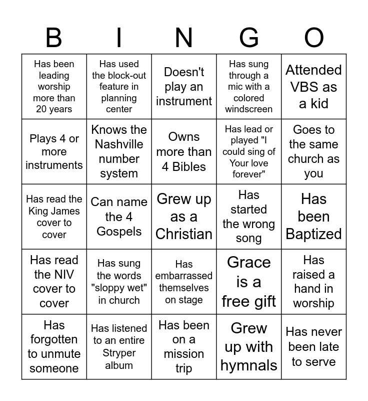 This bingo card has 25 words: Has sung the words "sloppy wet" in church, Has been on a mission trip, Owns more than 4 Bibles, Has forgotten to unmute someone, Attended VBS as a kid, Has been leading worship more than 20 years, Plays 4 or more instruments, Has used the block-out feature in planning center, Has started the wrong song, Has embarrassed themselves on stage, Has lead or played "I could sing of Your love forever", Has read the King James cover to cover, Grace is a free gift, Has raised a hand in worship, Knows the Nashville number system, Has never been late to serve, Has been Baptized, Doesn't play an instrument, Goes to the same church as you, Can name the 4 Gospels, Grew up as a Christian, Has listened to an entire Stryper album, Has read the NIV cover to cover, Has sung through a mic with a colored windscreen and Grew up with hymnals.