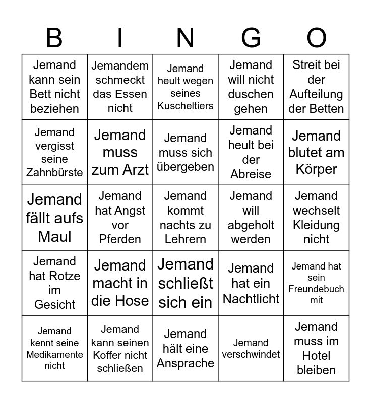 This bingo card has 25 words: Jemand macht in die Hose, Jemand hält eine Ansprache, Jemand muss sich übergeben, Jemand kennt seine Medikamente nicht, Streit bei der Aufteilung der Betten, Jemand kann sein Bett nicht beziehen, Jemand vergisst seine Zahnbürste, Jemandem schmeckt das Essen nicht, Jemand will abgeholt werden, Jemand schließt sich ein, Jemand heult bei der Abreise, Jemand fällt aufs Maul, Jemand hat ein Nachtlicht, Jemand hat sein Freundebuch mit, Jemand muss zum Arzt, Jemand muss im Hotel bleiben, Jemand wechselt Kleidung nicht, Jemand heult wegen seines Kuscheltiers, Jemand blutet am Körper, Jemand hat Angst vor Pferden, Jemand kommt nachts zu Lehrern, Jemand kann seinen Koffer nicht schließen, Jemand hat Rotze im Gesicht, Jemand will nicht duschen gehen and Jemand verschwindet.