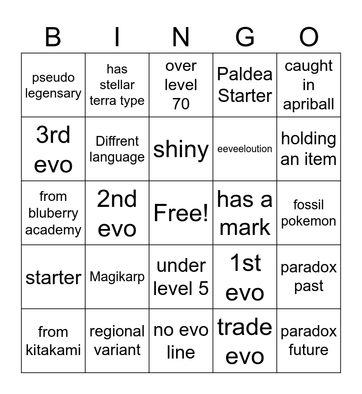 This bingo card has a free space and 24 words: Magikarp, regional variant, shiny, from kitakami, caught in apriball, pseudo legensary, 3rd evo, has stellar terra type, has a mark, under level 5, eeveeloution, from bluberry academy, 1st evo, paradox past, Diffrent language, trade evo, fossil pokemon, over level 70, holding an item, 2nd evo, paradox future, starter, Paldea Starter and no evo line.