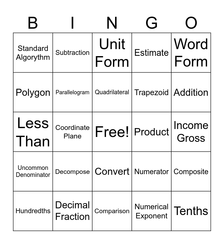 This bingo card has a free space and 45 words: Place Value, Tenths, Decimal, Hundredths, Thousandths, Numerical Exponent, Unit Form, Standard Form, Word Form, Decimal Fraction, Estimate, Product, Convert, Decompose, Regroup, Comparison, Greater Than, Less Than, Multiply, Addition, Subtraction, Expanded Notation, Estimate, Standard Algorythm, Budgeting, Income Gross, Income Tax, Denominator, Numerator, Uncommon Denominator, Factors, Composite, Prime, Quantity, Exponent, Coordinate Plane, x-axis, y-axis, Grid, Quadrilateral, Polygon, Trapezoid, Rhombus, Parallelogram and Right Angle.