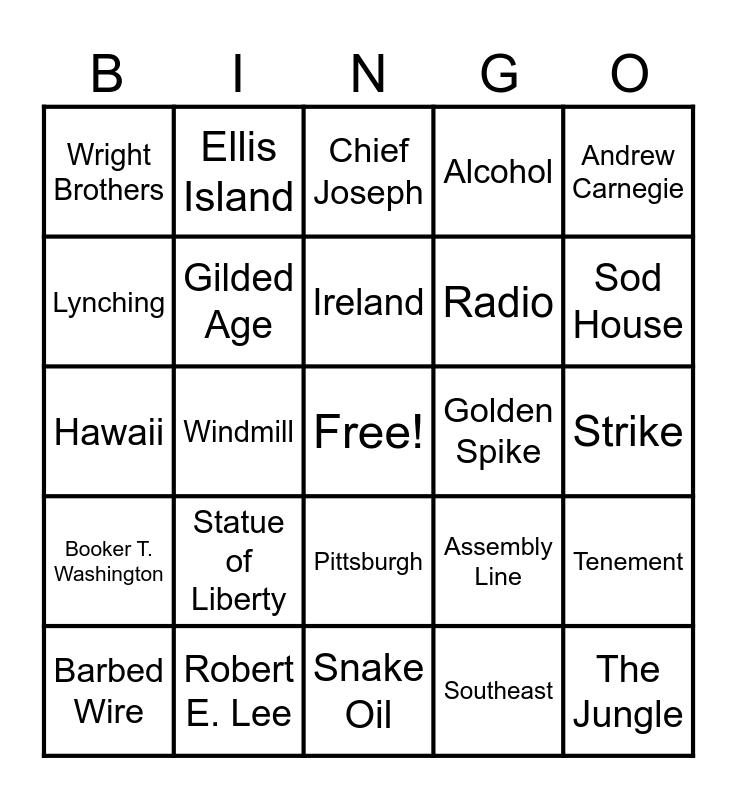 This bingo card has a free space and 33 words: Reconstruction, Abraham Lincoln, Windmill, John Deere, Booker T. Washington, Gilded Age, Andrew Carnegie, Barbed Wire, Ellis Island, Thomas Edison, Ireland, Chief Joseph, Buffalo, Nat Love, Golden Spike, Sod House, Robert E. Lee, Hawaii, Statue of Liberty, Assembly Line, Pittsburgh, Child Labor, Wright Brothers, Strike, Snake Oil, The Jungle, Alcohol, Radio, Lynching, Tenement, Homestead Act, Southeast and Amendment.