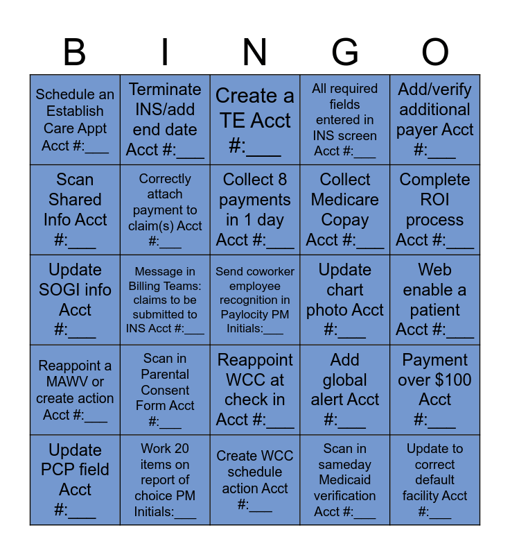 This bingo card has a free space and 24 words: Scan in Parental Consent Form Acct #:___, Work 20 items on report of choice PM Initials:___, Collect 8 payments in 1 day Acct #:___, Update PCP field Acct #:___, Add/verify additional payer Acct #:___, Schedule an Establish Care Appt Acct #:___, Scan Shared Info Acct #:___, Terminate INS/add end date Acct #:___, Update chart photo Acct #:___, Reappoint WCC at check in Acct #:___, Collect Medicare Copay Acct #:___, Update SOGI info Acct #:___, Add global alert Acct #:___, Payment over $100 Acct #:___, Correctly attach payment to claim(s) Acct #:___, Scan in sameday Medicaid verification Acct #:___, Web enable a patient Acct #:___, Create a TE Acct #:___, Complete ROI process Acct #:___, Message in Billing Teams: claims to be submitted to INS Acct #:___, Update to correct default facility Acct #:___, Reappoint a MAWV or create action Acct #:___, All required fields entered in INS screen Acct #:___ and Create WCC schedule action Acct #:___.