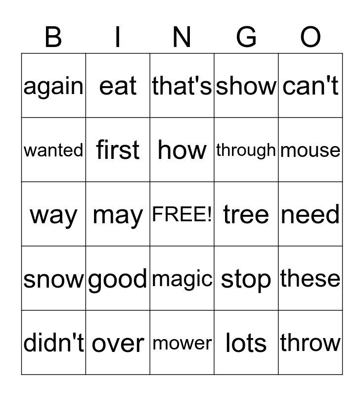 This bingo card has a free space and 24 words: good, over, how, didn't, can't, again, wanted, eat, tree, magic, through, way, stop, these, first, lots, need, that's, mouse, may, throw, snow, show and mower.