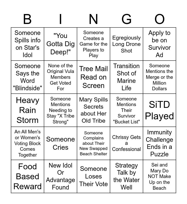 This bingo card has a free space and 24 words: Someone Cries, New Idol Or Advantage Found, Tree Mail Read on Screen, Food Based Reward, Apply to be on Survivor Ad, Someone Spills info on Star's Idol, Someone Says the Word "Blindside", "You Gotta Dig Deep!", Someone Mentions Their Survivor "Bucket List", Someone Complains about Their New Swapped Beach Shelter, Transition Shot of Marine Life, Heavy Rain Storm, Chrissy Gets a Confessional, Immunity Challenge Ends in a Puzzle, None of the Original Vula Members Get Voted For, Strategy Talk by the Water Well, SiTD Played, Someone Creates a Game for the Players to Play, Someone Mentions the Merge or the Million Dollars, Someone Mentions Needing to Stay "X Tribe Strong", Sei and Mary Do NOT Make Up on the Beach, An All Men's or Women's Voting Block Comes Together, Egregiously Long Drone Shot and Someone Loses Their Vote.