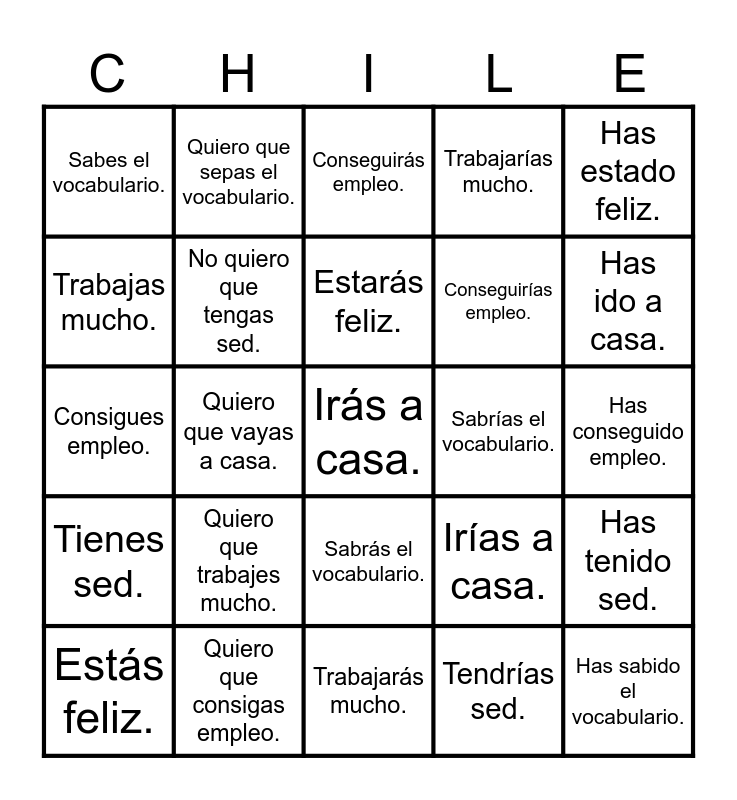 This bingo card has 30 words: Estás feliz., Quiero que estés feliz., Estarás feliz., Estarías feliz., Has estado feliz., Sabes el vocabulario., Quiero que sepas el vocabulario., Sabrás el vocabulario., Sabrías el vocabulario., Has sabido el vocabulario., Tienes sed., No quiero que tengas sed., Tendrás sed., Tendrías sed., Has tenido sed., Vas a casa., Quiero que vayas a casa., Irás a casa., Irías a casa., Has ido a casa., Consigues empleo., Quiero que consigas empleo., Conseguirás empleo., Conseguirías empleo., Has conseguido empleo., Trabajas mucho., Quiero que trabajes mucho., Trabajarás mucho., Trabajarías mucho. and Has trabajado mucho..