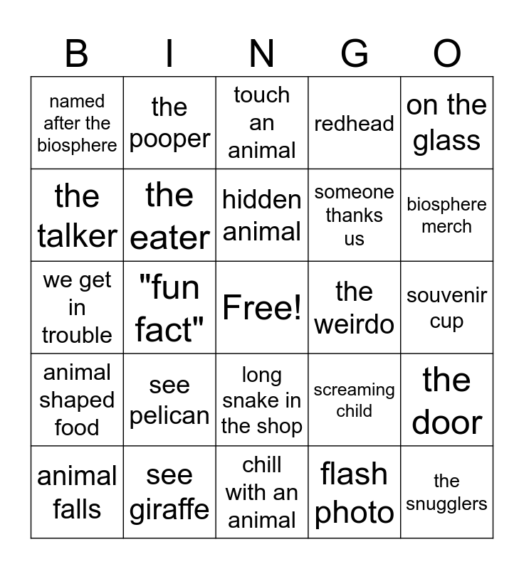 This bingo card has a free space and 24 words: see pelican, see giraffe, hidden animal, animal falls, on the glass, named after the biosphere, the talker, the pooper, the weirdo, long snake in the shop, someone thanks us, we get in trouble, screaming child, the door, the eater, flash photo, souvenir cup, touch an animal, biosphere merch, "fun fact", the snugglers, animal shaped food, redhead and chill with an animal.