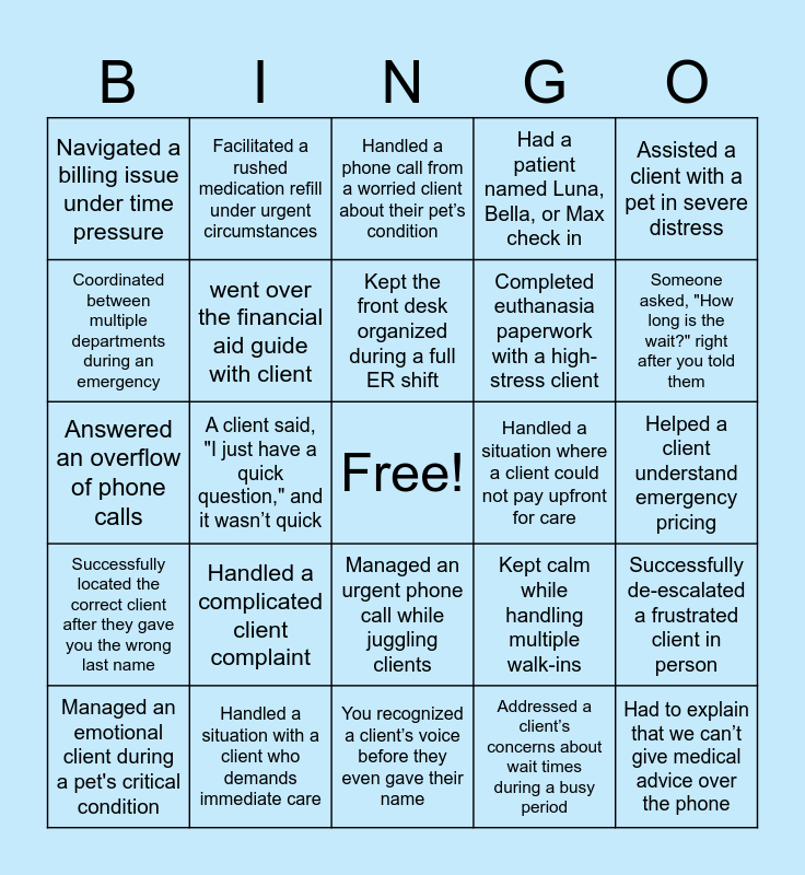 This bingo card has a free space and 24 words: Handled a complicated client complaint, Handled a situation with a client who demands immediate care, Kept the front desk organized during a full ER shift, Managed an emotional client during a pet's critical condition, Assisted a client with a pet in severe distress, Navigated a billing issue under time pressure, Coordinated between multiple departments during an emergency, Facilitated a rushed medication refill under urgent circumstances, Handled a situation where a client could not pay upfront for care, Managed an urgent phone call while juggling clients, Completed euthanasia paperwork with a high-stress client, Answered an overflow of phone calls, Kept calm while handling multiple walk-ins, Successfully de-escalated a frustrated client in person, went over the financial aid guide with client, Addressed a client’s concerns about wait times during a busy period, Helped a client understand emergency pricing, Handled a phone call from a worried client about their pet’s condition, Someone asked, "How long is the wait?" right after you told them, A client said, "I just have a quick question," and it wasn’t quick, Had to explain that we can’t give medical advice over the phone, Successfully located the correct client after they gave you the wrong last name, Had a patient named Luna, Bella, or Max check in and You recognized a client’s voice before they even gave their name.