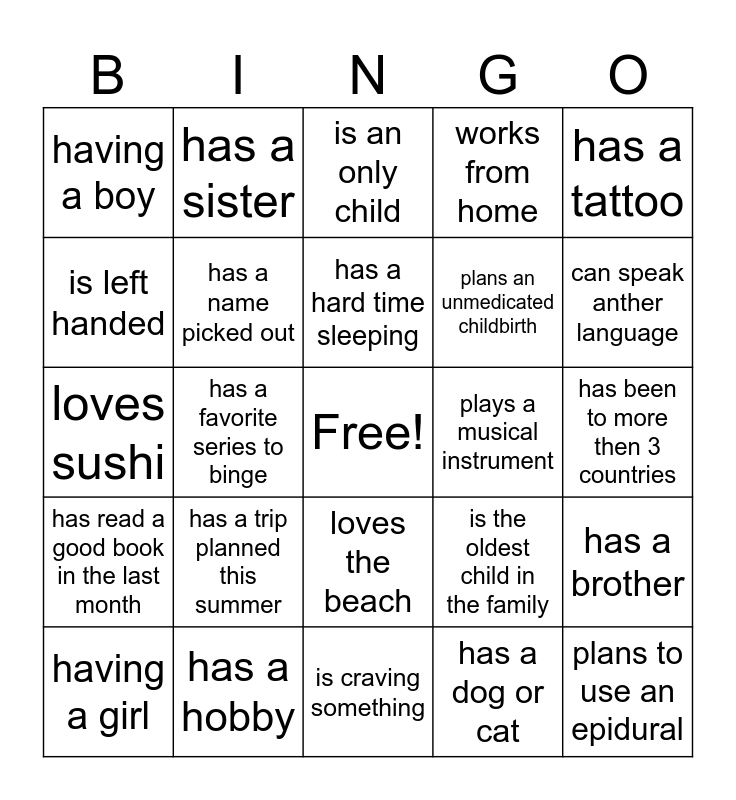 This bingo card has a free space and 29 words: having a girl, loves sports, has a favorite series to binge, plans to breast feed, having a boy, is an only child, has a name picked out, has a trip planned this summer, plays a musical instrument, has a hobby, has been to more then 3 countries, plans to use an epidural, is craving something, has a dog or cat, can speak anther language, loves coffee, loves the beach, has read a good book in the last month, has a tattoo, loves sushi, is the oldest child in the family, is born in the same month as you, plans an unmedicated childbirth, is left handed, works from home, has a sister, has a brother, has a hard time sleeping and is right handed.