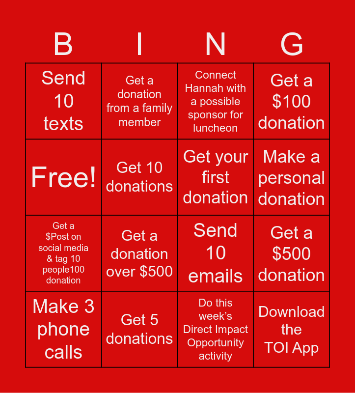 This bingo card has 16 words: Get 5 donations, Get a $500 donation, Connect Hannah with a possible sponsor for luncheon, Send 10 texts, Get a $Post on social media & tag 10 people100 donation, Get a donation from a family member, Send 10 emails, Do this week’s Direct Impact Opportunity activity, Free!, Get 10 donations, Make 3 phone calls, Get a $100 donation, Get a donation over $500, Make a personal donation, Get your first donation and Download the TOI App.
